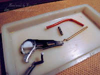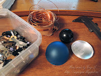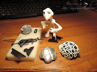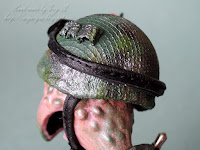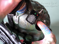 А теперь несколько фотографий процесса. Панцирь - пластиковая крышечка и кусочек жестяной банки, рисунок контуром. Каска - крышечка от духов, обтянутая реденькой тканью, покрашена под камуфляж.