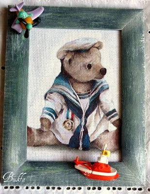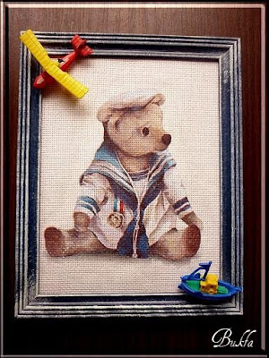 На коробочке мишка с моей любимой салфетки. Раньше я делала для двух внучек с этим мишкой ленивые вышивки. Давно хотела посадить этого морячка и на коробку.