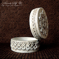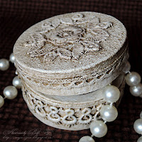 Сначала сделала вот эту шкатулочку. Причем изначально на крышке были ландыши, а когда пристроила по бокам каменные кружева, она показалась мне такой несуразной... пришлось замазать картинку и закружевить крышку тоже!