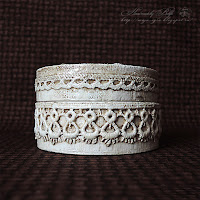 Вот такая баночка получилась! Мне понравилась больше шкатулки (шкатулочку надо было побольше брать. а эта всего 6 см в диаметре). Однако, хочу сказать, что, если бы кружева были не цветочные, а какие-нибудь... готические, было бы лучше... стильно!