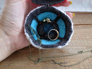 Без содержимого у шерстяной шкатулки немного перевешивает передняя часть с магнитом, поэтому если ее наполнять чем-то легким и воздушным, - можно воспользоваться ее мягкостью, и выгнуть на донышке ямку.