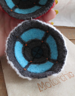 Разумеется, у меня материалом выступила шерсть, металл есть лишь в маленьком соединительном колечке, а под "пусковой кнопкой" спрятался листовой магнит. Ну и немножко мононити для лучшего скрепления слоев шерсти и придания окантовке жесткости.