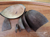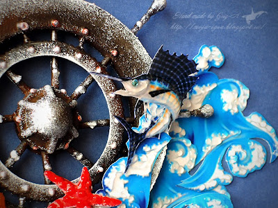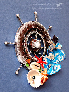 Кстати, штурвал вырезан Игорем из толстого картона, склеенного из нескольких слоев тонкого, покрашен и тонирован акриловыми красками. Ракушки, камушки и жемчужины натуральные, все остальное - "вырубка".