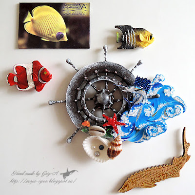 У нас получился магнитик на холодильник - память о морском отдыхе. На магните штурвал той бригантины, на которой мы плыли в бушующем море. Белые барашки, морские звезды, ракушки с жемчужинами... И вдруг на гребне волны появляется парусник... но не корабль, а рыба марлин с длинным носом и прекрасным синим плавником-парусом! Ура! Теперь нас ждет удача!:)))