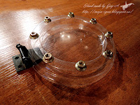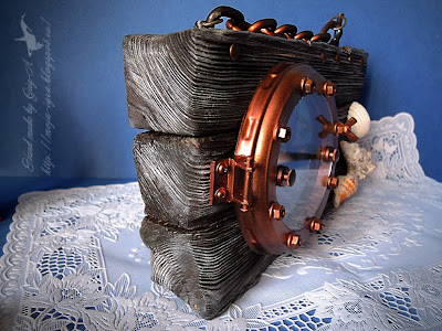 По материалам - как всегда использовано то, что нашлось под рукой: кусочки брусков, оставшиеся от строительства на даче, подходящая цепочка, найденная тоже на даче, крышка от пластиковой баночки, старая, неизвестно от чего, петля, гайки, шайбы, подошедшее самым странным образом к крышке баночки круглое стекло, и конечно, ракушки.