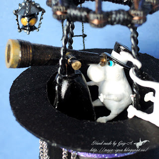 Шар украшен накладочками, цепочками, шнурочками... впрочем, это не просто украшения, а необходимые атрибуты для любого аэростата. Кстати, однажды один летательный аппарат пролетал над папиным маяком, и вот тогда Муми-папа и задумал построить свой собственный воздушный шар - и построил)))