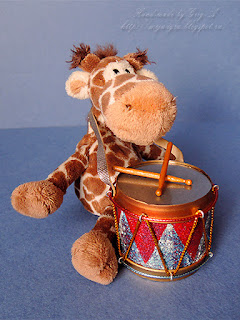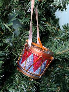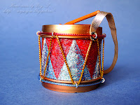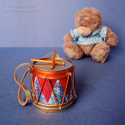 А вот барабанчик превратился в елочное украшение. Сразу можно представить его размеры: диаметр - 5 см и высота - 5 см.