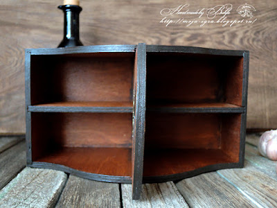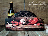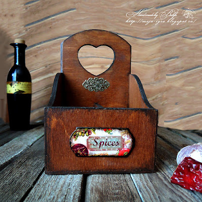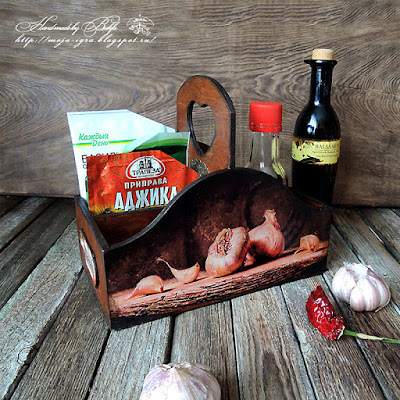 Самое мое нелюбимое занятие в декупаже - красить красками))) Вот и стараюсь обходиться без них. Здесь дубовая морилка в два слоя и декупаж распечаткой. Долго выбирала картинки, хотелось, чтобы были специи и красивые картинки одновременно да еще пригодные для декупажа, т.е., не очень похожие на натуральные фото! Ох, перерыла весь интернет, но все-таки немного не то! а?