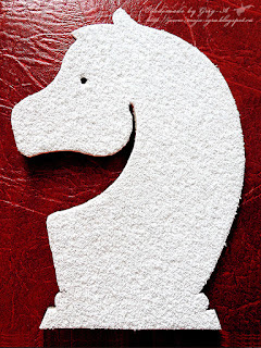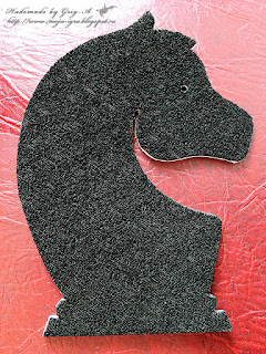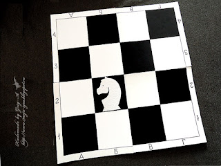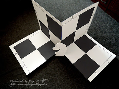Конь один, но с разных сторон разного цвета, вырезан из остатков переплетного картона, который специально покупали для доски, размером листы были 70см на 120 см. Понадобилось таких в работе четыре штуки: Игорь вырезал восемь квадратов 50х50см, склеил их в два слоя, проложив между слоями холст с пропиткой - таким образом соединил три квадрата; затем обработал с обеих сторон лаком "Цапон", чтобы картон не покоробился от краски, покрасил клетки белой краской и черным колорантом. А уж потом использовал остатки картона на коня!)))