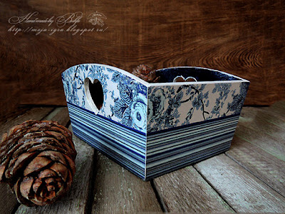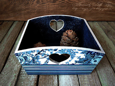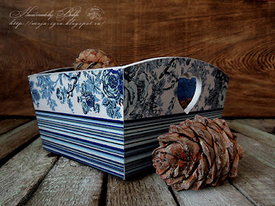 Внутренность получилась какая-то джинсовая - синяя с туда-сюда потертостями, т.е., покрасила, а потом пошкрябала наждачкой в двух перпендикулярных направлениях.