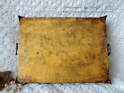Фасады с ручкамии патинированными филиграньками позолотила воском. В центре накладочки наклккны граненые стразы цвета "сепия". Поднос поставила на ножки-лапки, тоже позолотила
