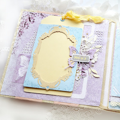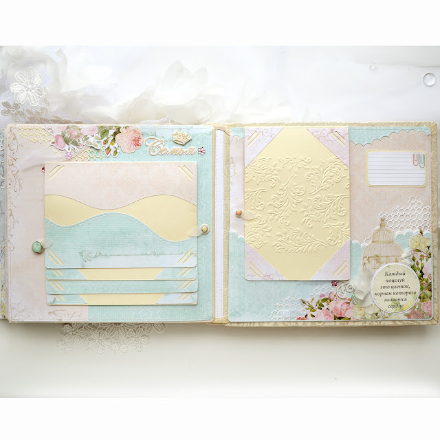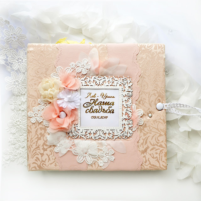 Хочу показать сегодня свадебный альбом из коллекции бумаги FLEUR design "веление сердца" Размер альбома 21 на 24см вместимость 50-60 фото размером 10 на 15см. Мягкая обложка из жаккарда, с флисовой прокладкой, декоративные полоски из розового кожзама, надпись под пленкой. Рамку из чипборда покрыла белой пудрой и приклеила на бумажную подложку, украсила тканевыми и кружевными цветами.