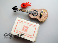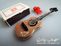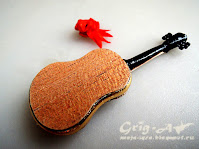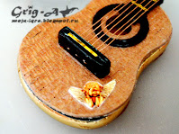 Гитара собрана как настоящая: гриф - палочка для шашлычка, голова - из можжевельника, струны - медная проволока. Лицевая и обратная сторона корпуса - шпон какого-то благородного дерева из сигарной коробки.