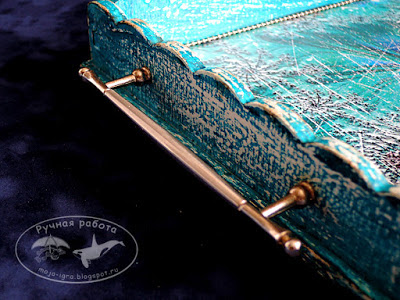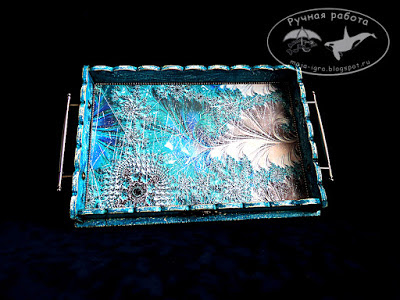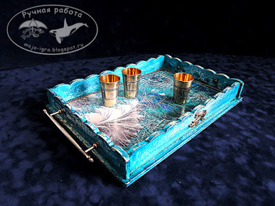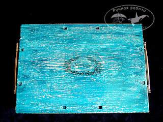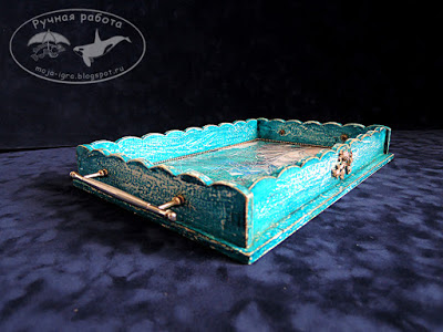 Сначала покрасили поднос в цвет Тиффани, первый слой был белый. Правда, не успела я просить Игоря немного добавить черной красочки в бирюзу - цвет немного бы изменился и стал более теплым и глубоким.