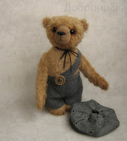 Шплинтовое соединение конечностей и головы. Мальчик хорошо стоит сам на ножках. Глазки из Германии (стекло). Нос и коготки - "Ирис". Тонирован художественными масляными красками. Одежда из натуральных смесовых тканей, кепка снимается, штанишки имеют под деревянной пуговкой кнопочку. На шее замшевый шнурочек.