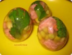 Это скорлупа от яиц))). Берём яйцо. Аккуратно, чтоб не повредить его полностью, делаем отверстие и выливаем из него белок и желток. Потом промываем и заливаем в скорлупу заливное. (красненькое на фото - это клюква, она здесь для украшения). Далее кладём в ячейку для яиц и отправляем в холодильник, чтоб содержимое застыло. После просто убираем скорлупу. Более подробно напишу позже, когда найду рецепт.