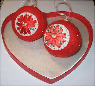 шарика с вышивкой. На одном пуансеттия вышита атласной лентой, а на