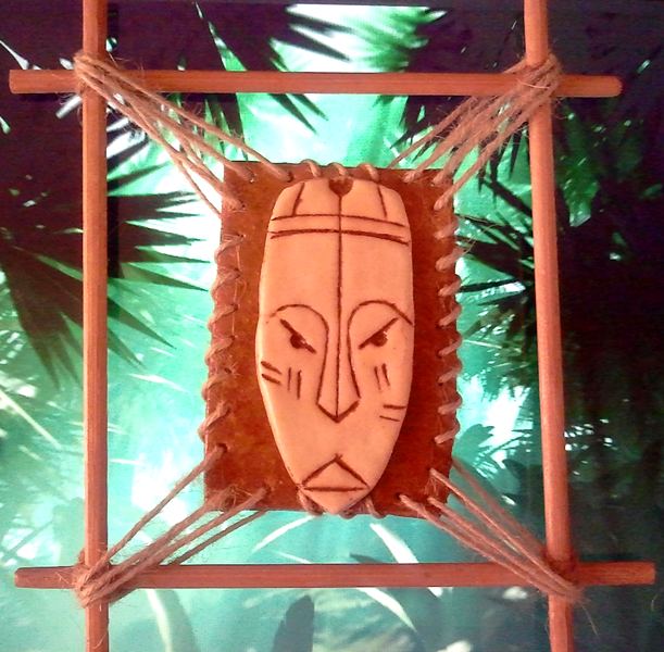 Маску я задумала давно, вообще болею африканской темой, сама не знаю почему и вот наконец я ее собрала. Рамка из палочек для суши, шпагат, фон и сама маска из теста