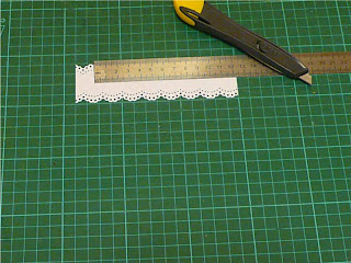6. Приклеиваем цветную бумагу на белую, совмещая рисунок фестонов и регулируя необходимую ширину белого края (использую клей момент кристалл, так как он быстро сохнет, не "ведет" бумагу, а нечаянно выступившие капельки легко скатать чистым пальцем без ущерба для работы). Так как белые полоски вырезаны длиннее цветных и по длине, и по ширине, у нас есть возможность таких регулировок. После приклеивания обрезаем лишнюю белую бумагу.