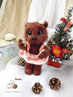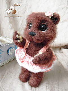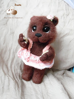 Вообще, это законченный мишка с мастер-класса. Когда я его практически закончила и уже во всю занималась распушкой, я сломала в области его бедра две обратные иголочки. Это получилось почти случайно, Эля (в смысле, я) махнула рукой, задела слегка иголочки, которые торчали из тела. Тихий хруст и мое настроение помрачнело моментально.
