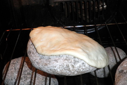 И третий вариант - камни в чугунной сковороде. Как видите, на камнях отлично печется арабский хлеб - пита. На раскаленном камне лепешка быстро расслаивается, верхняя часть ее поднимается горячим паром изнутри, и внутри образуется полость - кармашек. Их можно или просто есть, или заполнить этот кармашек любой начинкой: жареным мясом, салатом и т.д.