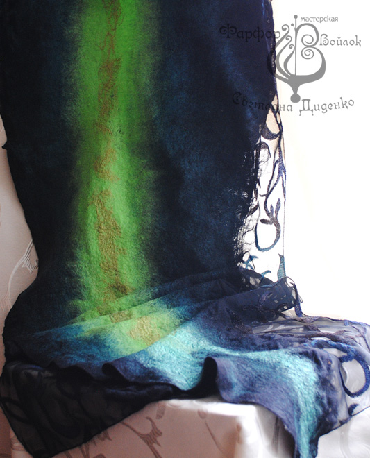Необыкновенный, чудесный шарф с шифоновыми элементами - элегантный, и создает невесомое настроение таинственности и стиля. Созданный из высококачественной мериносовой шерсти, украшен волокнами шелка малберри и тусса шарф длиной 3 метра весит всего 150 граммов.