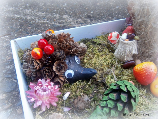 Ёжик из шишек лиственницы, запасливый - ягодки, яблочки несет домой...