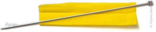 Нарежем полосок гофрированной бумаги размером примерно 6 × 20 см. Спицы я взяла потоньше, диаметром 4,5 см.