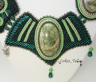 Кабошоны лиственита, риволи, чешские бусины, акриловые бусины, бисер чешский, бисер японский, стеклярус, фурнитура под серебро.