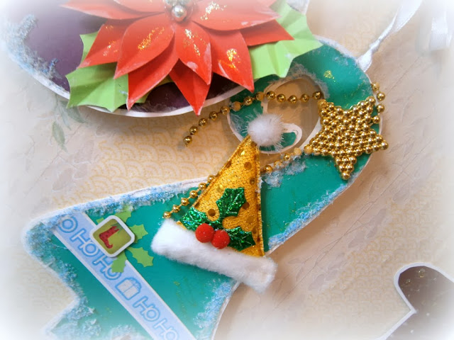 взяли яркую новогоднюю скрапбумагу, глиттер, голубой цветочный мох для снега,
