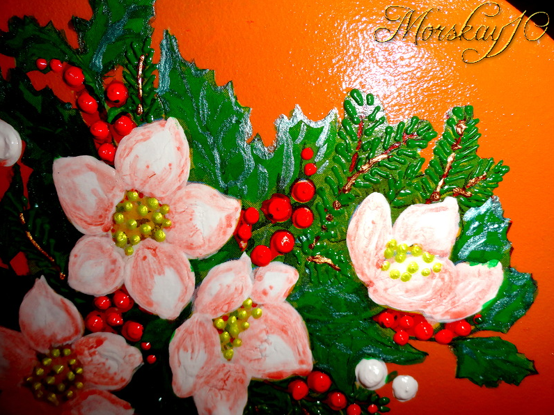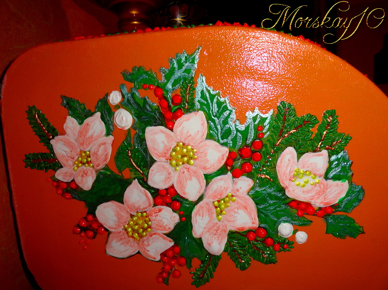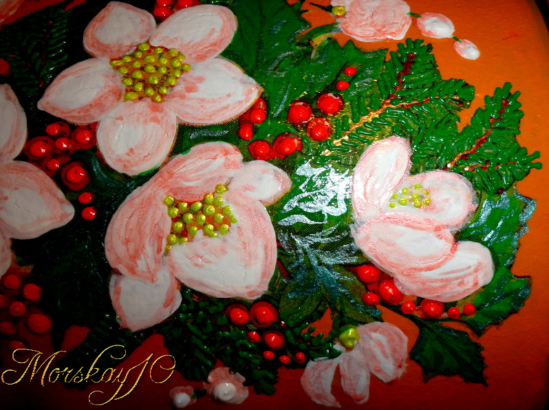 Итак, была обычная белая металлическая старая хлебница, на которой сохранилась даже выбитая на дне цена - 3рубля 75 копеек :)) Я её покрасила акриловой краской, затем нашла подходящую салфетку и сделала декупаж! А уже потом, поверх салфетки, расписывала цветы, (акриловыми красками), листья и ягодки (контурами)!