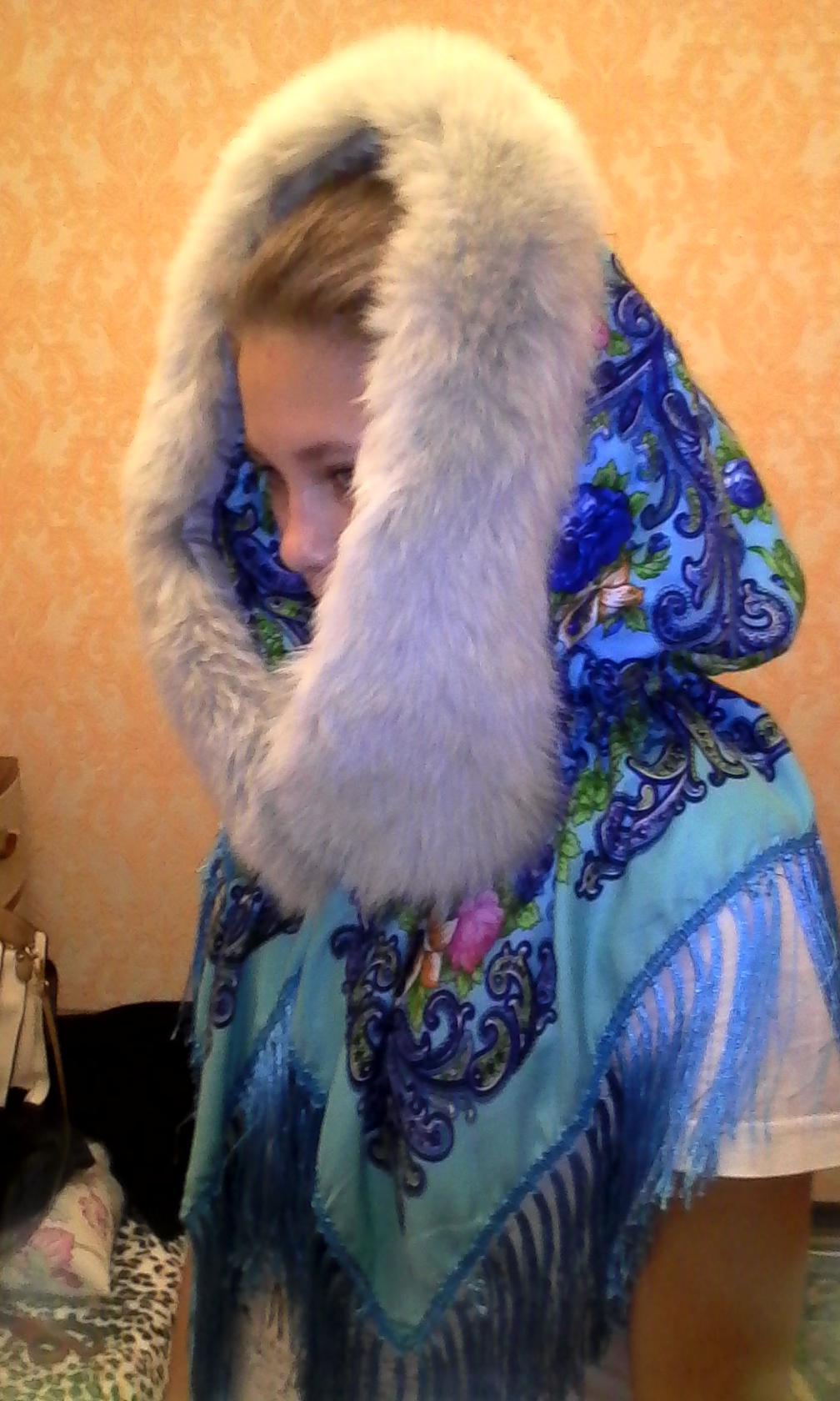 Спасибо, Вам большое. Нужен был теплый платок. Сделали по вашей выкройке. Павлопосадский платок утеплили флисом и украсили мехом.