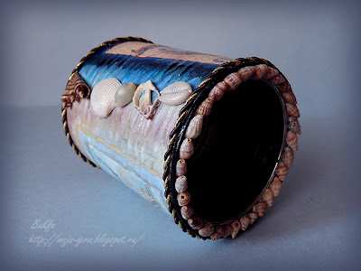 Верх украшен "венком" из мелких ракушек. Так мне кажется, что получилось очень похоже на венок. А послушать море можно, надев на ухо этот венок! :)))