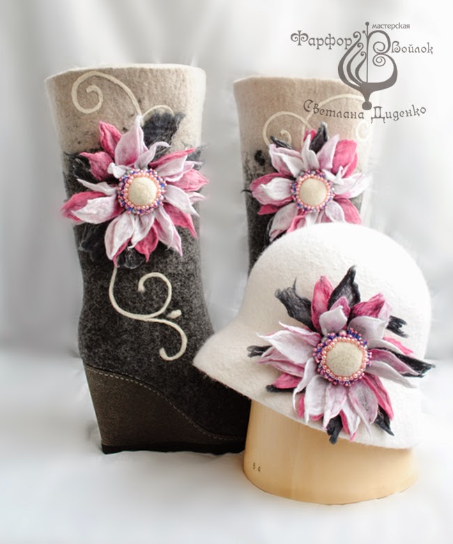 Света, обалденные валеночки, каждая пара поражает изяществом!!!!! Сумочка, шляпки прелестны. Света, некоторые валенки высокие и узкие, по ноге, а как удобно их одевать?. С Новым годом вас!!!!