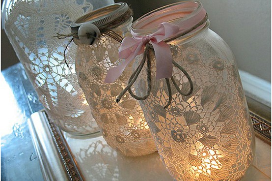 Необычно и очень романтично смотрятся подсвечники из кружевных баночек!