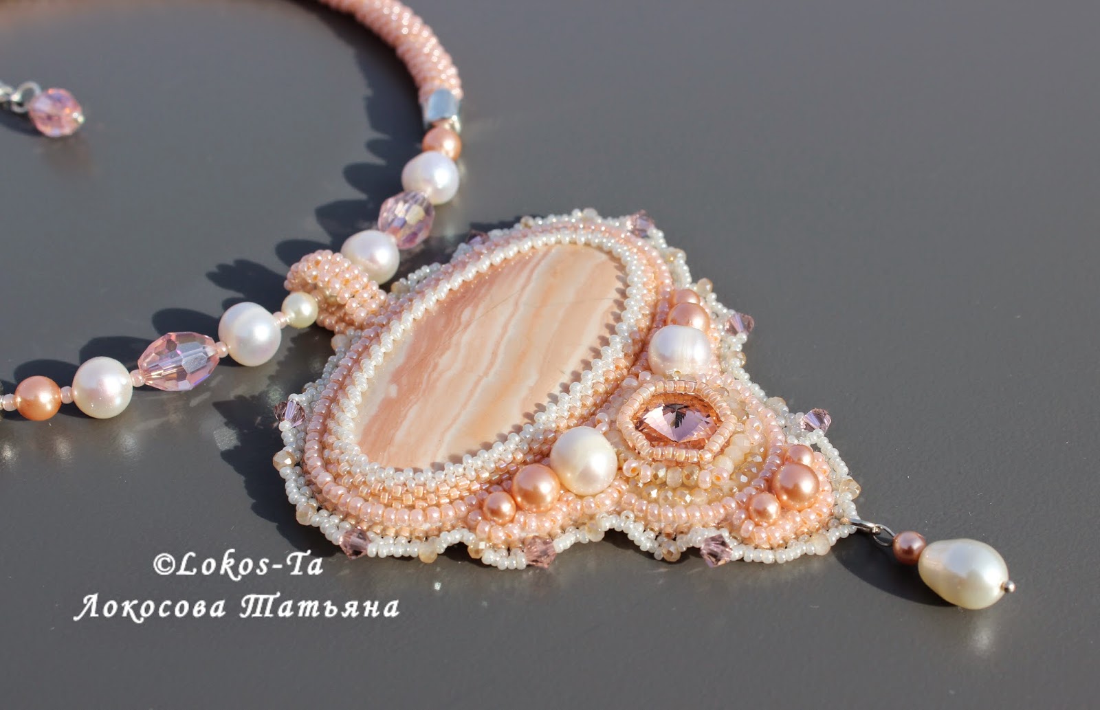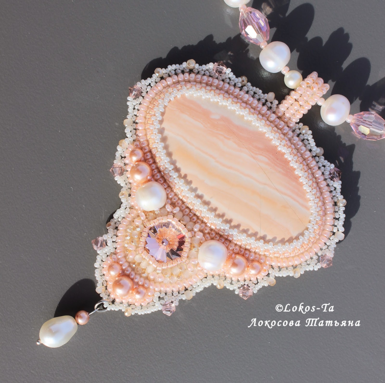 Кулон с персиковой яшмой. Нежного, вкусного цвета, на солнце сверкает и переливается кристаллами Сваровски и чешскими хрустальными бусинами. Воздушная оборочка из мельчайшего бисера придает ощущение легкости. Натуральный жемчуг и жемчуг Сваровски - изысканности и благородства.