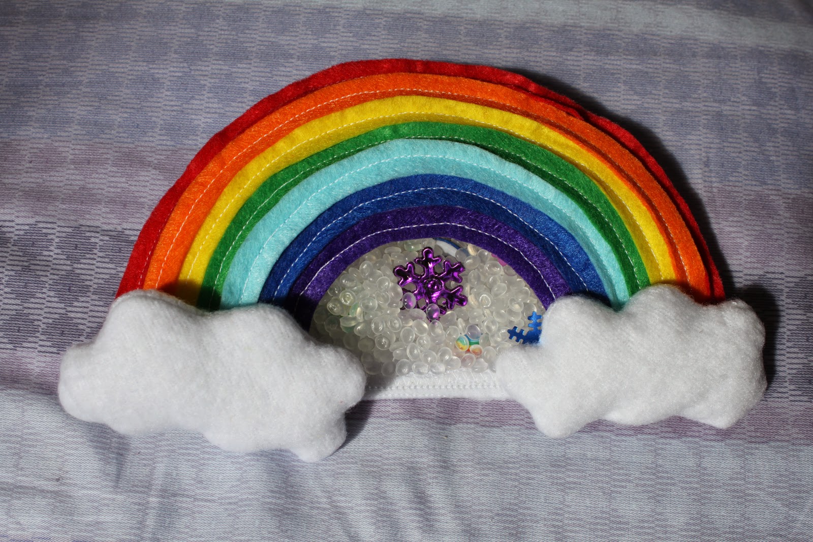 Сшита из белого флиса, фетра цветов радуги и плотного пластика. Наполнена гранулятом - специальным наполнителем для игрушек и пуговками, бусинами и пайетками (их и нужно отыскать вашему малышу). А еще игрушка предназначена для изучения цветов радуги и порядка их расположения (каждый охотник желает знать где сидит фазан). По весу игрушка как обычный сотовый телефон.
