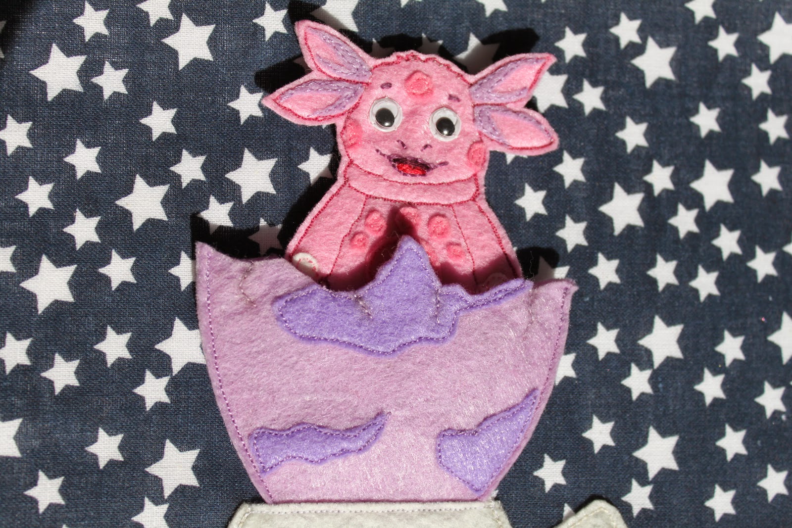 Открываем яйцо (верхняя часть снимается, открепляется - на кнопке). Нижняя часть пришита. Лунтик на липучке, глазки бегают.