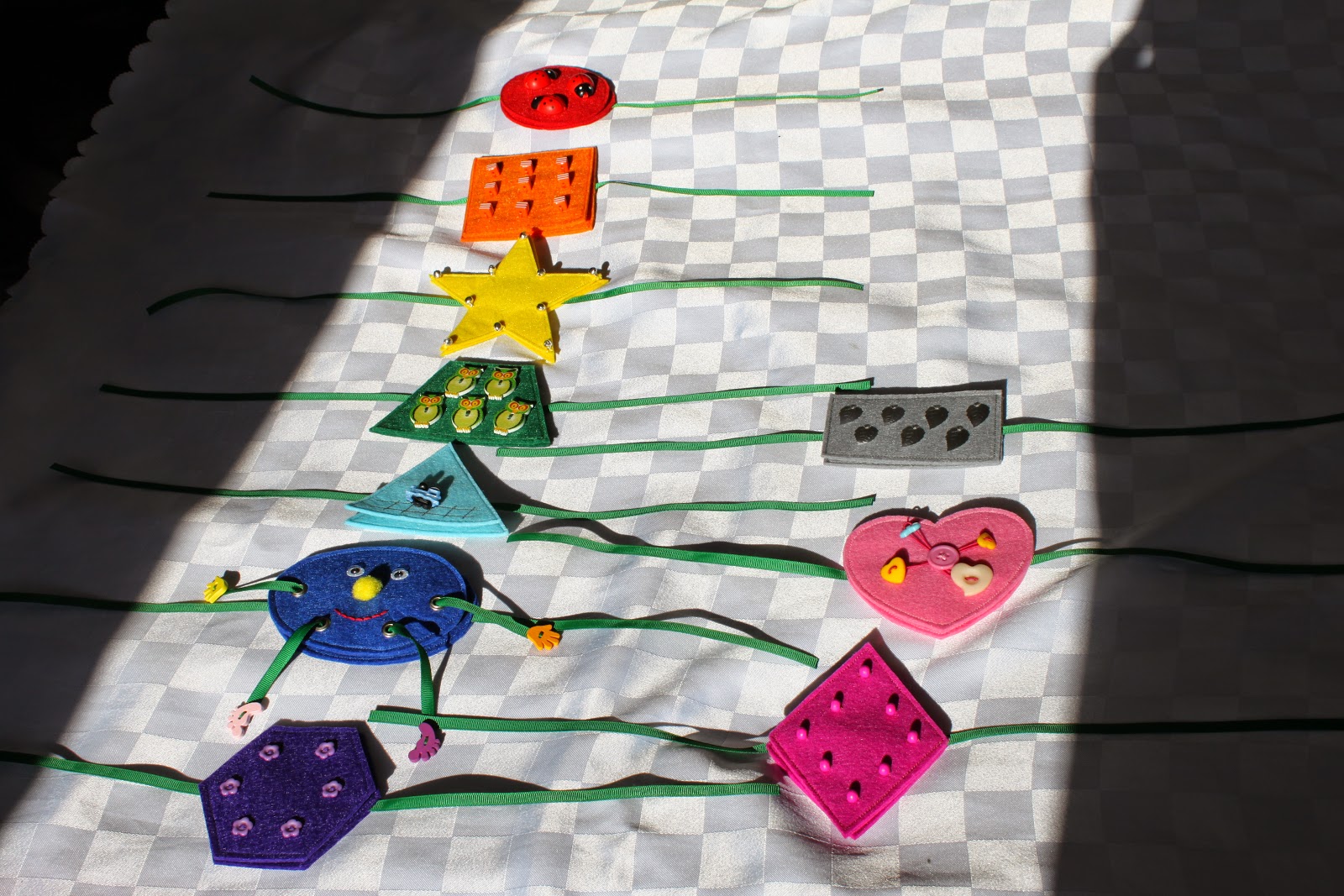 Вот как выглядит если открепить их от оснований. В процессе шитья придумалось, что цвета фигур будут на изучение цветов радуги + 3 цвета. Далее декорирование фигур сделала чтобы можно было еще изучать счет от 1 до 10 и + на овале можно изучить части лица и ручки, ножки. Ну и потрогать, подергать тоже все будет интересно))) на развитие мелкой моторики.