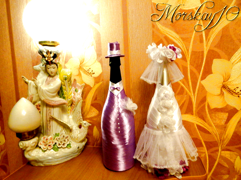 К бутылочкам сделала еще два фужера, для жениха и невесты. В тех же тонах.