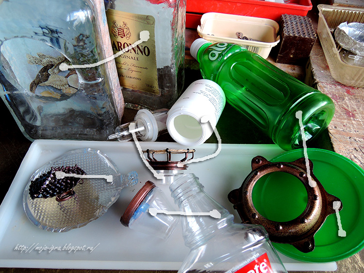 А это материалы и ход работы, что из чего делалось. Сначала в бутылке сделано отверстие, потом на другой грани бутылки - обратный и прямой декупаж, затем наклеен иллюминатор из дна бутылки и крышки банки, вместо пробки вставлен светильничек из лампа-диода с батарейкой, дальше в ход пошли баночки от витаминов, одноразовые капельницы и фольга от банки детского питания. В работе использованы металлические цепочка и шармики (якорь и ракушки. Рыбка внутри - стикер. Покрытие крыши - контур по стеклу и краска из баллончика.
