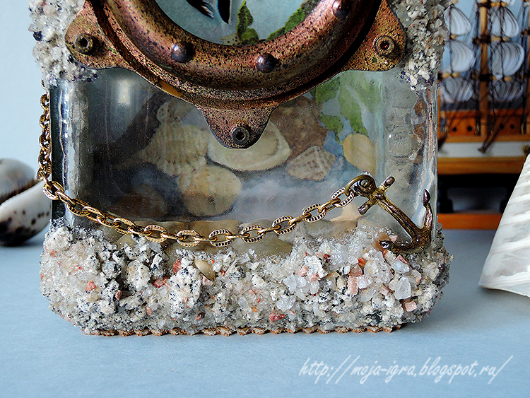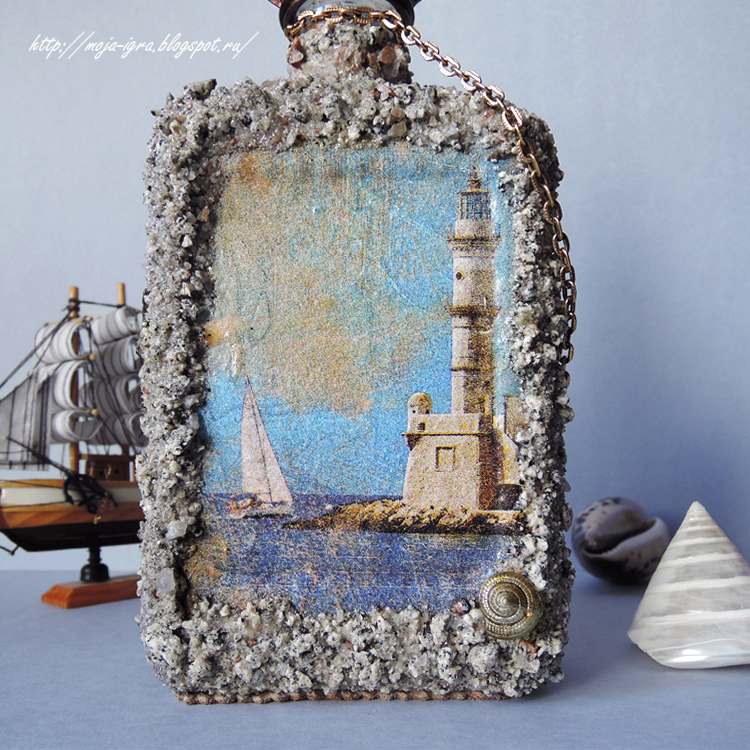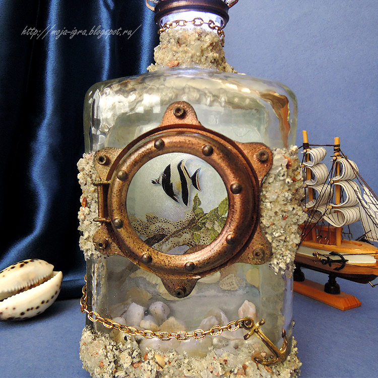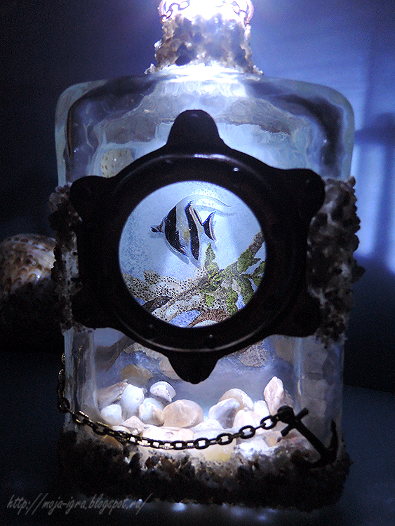 Конечно, он и не совсем маяк, накручено-наверчено на нем много всего и внутри и снаружи, но это же совсем маяк!))) Внутри - морское дно с камешками, водорослями и рыбками, все это можно увидеть через иллюминатор (в стекле бутылки вырезано отверстие).