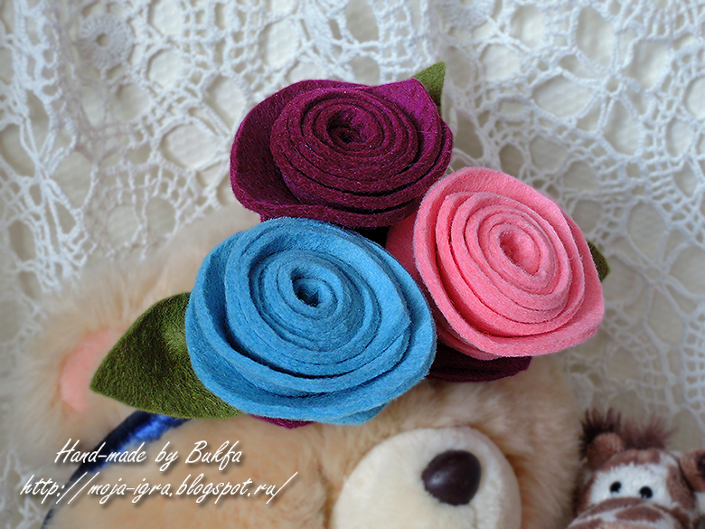 Давно мечтала попробовать сделать фетровые цветы. Получились три фетровые розы. По цвету они напомнили мне осенние астры - розовый и голубой - и георгины - свекольного цвета цветок.