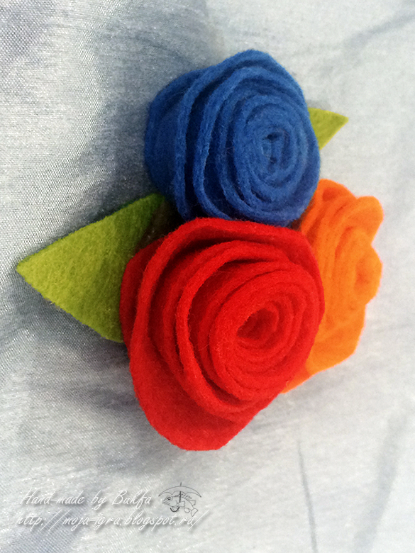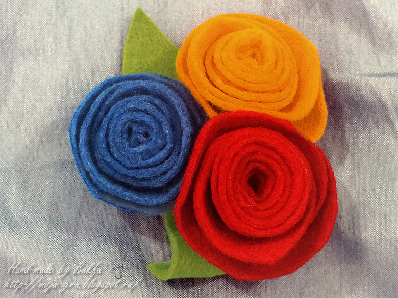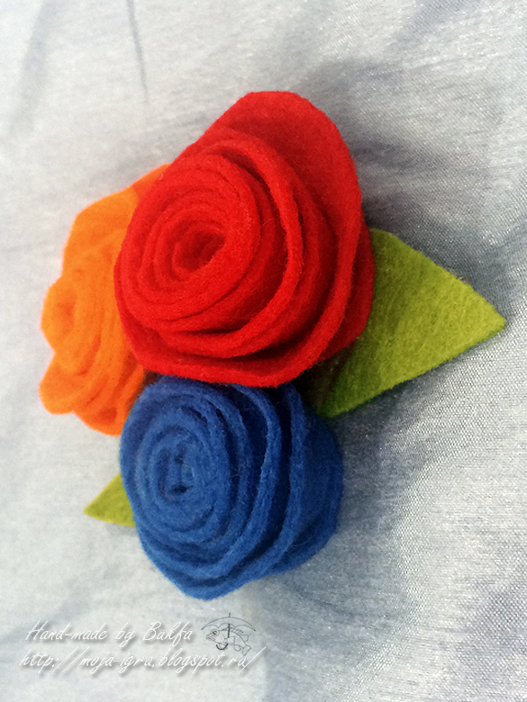 В ближайшем "Леонардо" купили фетр 2 мм (только такой и был на тот момент), поэтому цветы получились большие и толстенькие))) А вот три листика - из фетра потоньше, я их даже смогла сложить у основания.