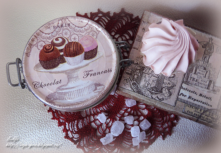 На крышке французский шоколад. Русский чай+ французский шоколад - очень вкусно. Кстати, в баночку можно и чай рассыпной положить, а еще каркаде будет хорошо смотреться!)))
