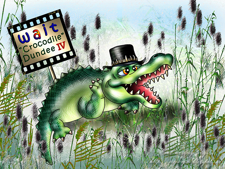 Жил на свете крокодил, который любил книги (он просто жил в энциклопедии "Жизнь животных") и смотреть кинофильмы. Особенно любил он фильмы про Крокодила Данди. Видите, сидит наш крокодил и днем и ночью в своей книжке (рисунки Игоря) и ждет четвертый фильм про своего кумира да еще и шляпу похожую надел. И был он очень добрый!