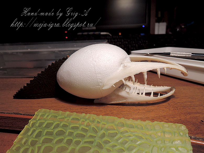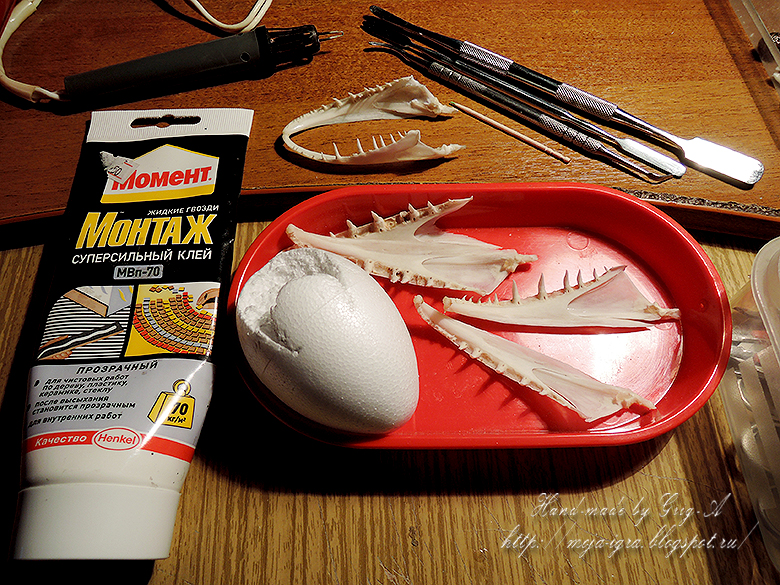 Как всегда показываю процесс и материалы: пенопластовое яйцо, щучья челюсть, кожа (хвост), замша (нёбо), 2 бусины(глаза), 2 гайки(ноздри), медная проволока, глины полимерные DAS и Claycraft soft Clay by DECO, клей Монтаж-жидкие гвозди, контур по стеклу Decola, акриловые и витражные краски Decola, аквалак ZAR. Кожа крокодила сделана из полимерной глины