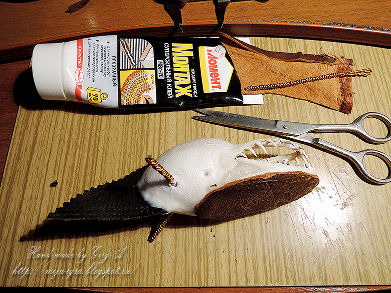 Теперь немножечко о процессе: соединяем яйцо-туловище, предварительно выбрав из него кусок для пасти, челюсти и кожаный хвост; наклеиваем кожу кусок кожи на пузо, выравнивая его; затем вставляем проволочные ноги, добавляем проволочные пальцы; наклеиваем кусок кожи на морду крокодила, на него ноздри-гайки; кожу крокодила делаем из раскатанного пласта полимерной глины;