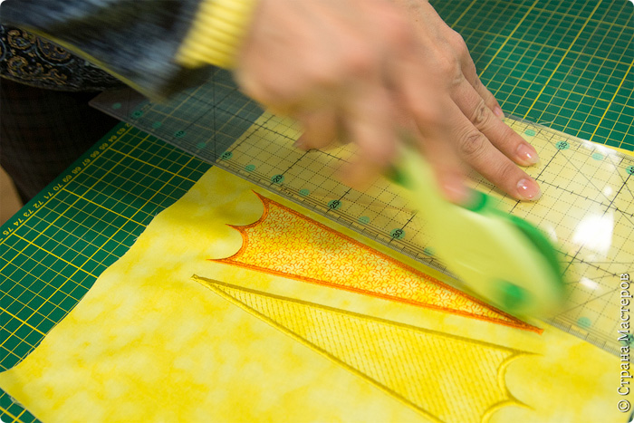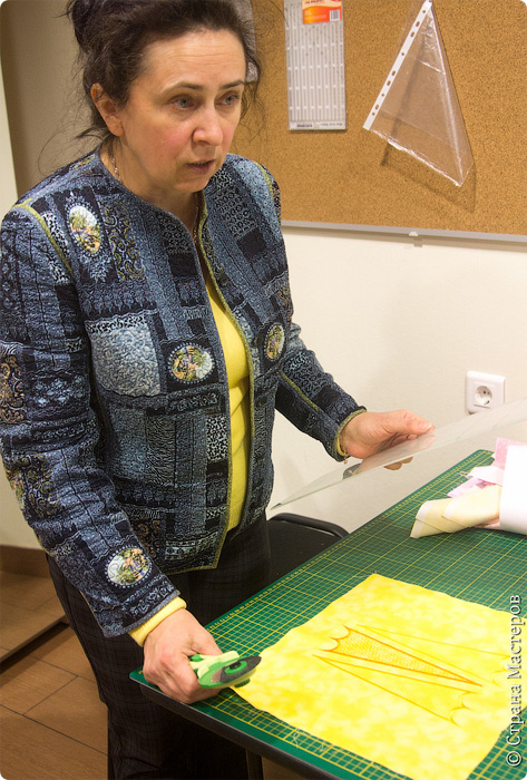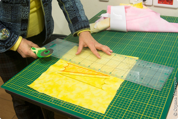 И сейчас показывает нам, как быстро, ровно и правильно можно резать ткань, пользуясь современными приспособлениями.