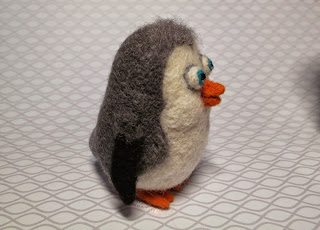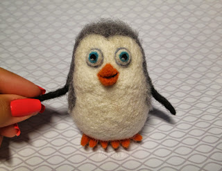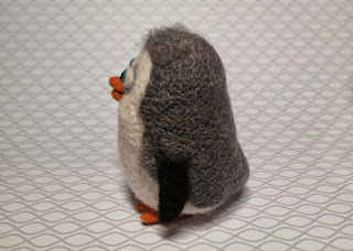 Для наращивания объема хвоста пришлось взять другую светло-серую шерсть, и частично она просвечивает, но по мультфильму у пингвиненка попка более светлая, чем верх тела, так что все в пределах допустимого :)